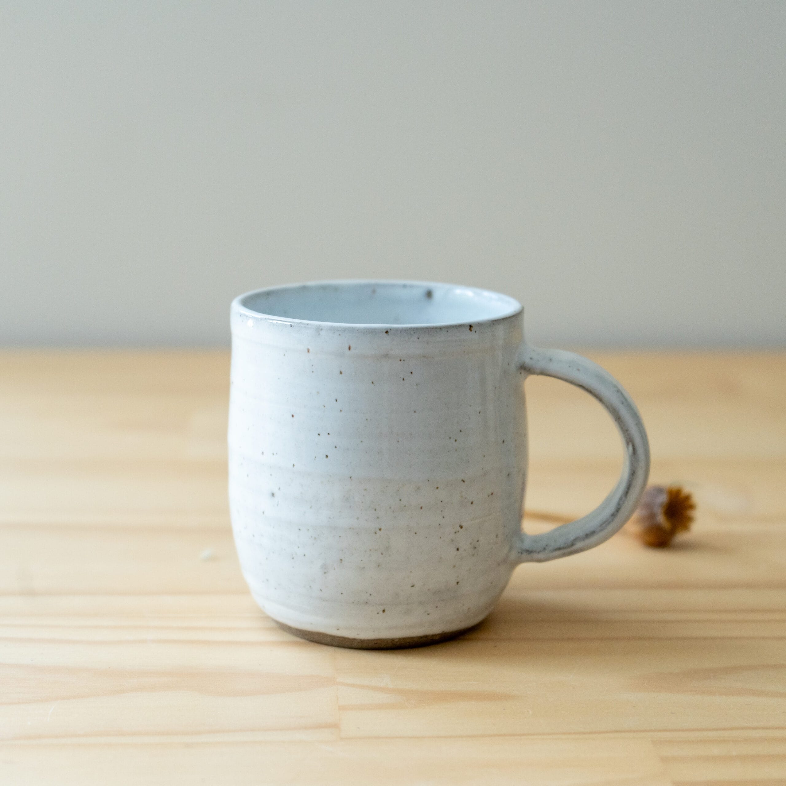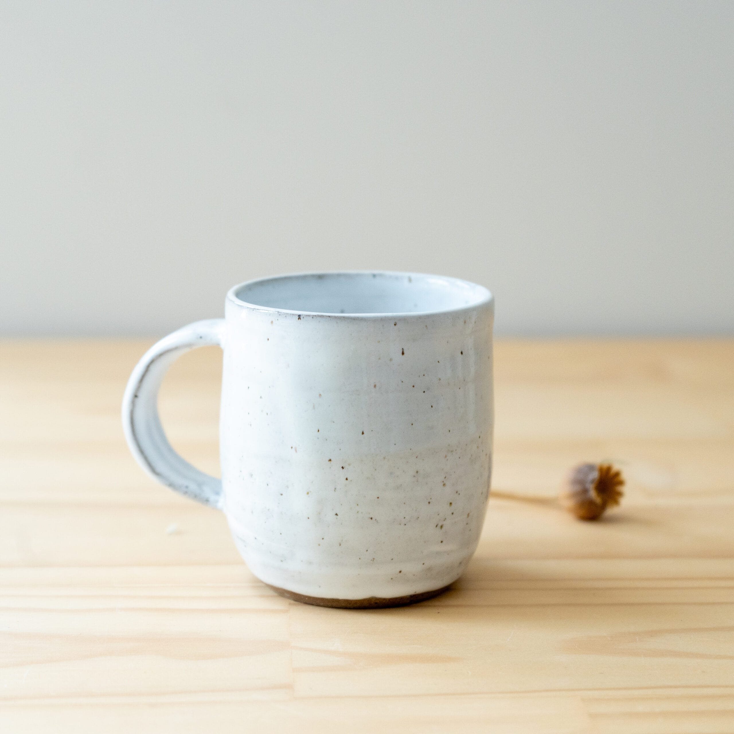 This cup has been handcrafted on a pottery wheel. It is made with New Zealand a mix of stoneware clays and finished with a white glaze.