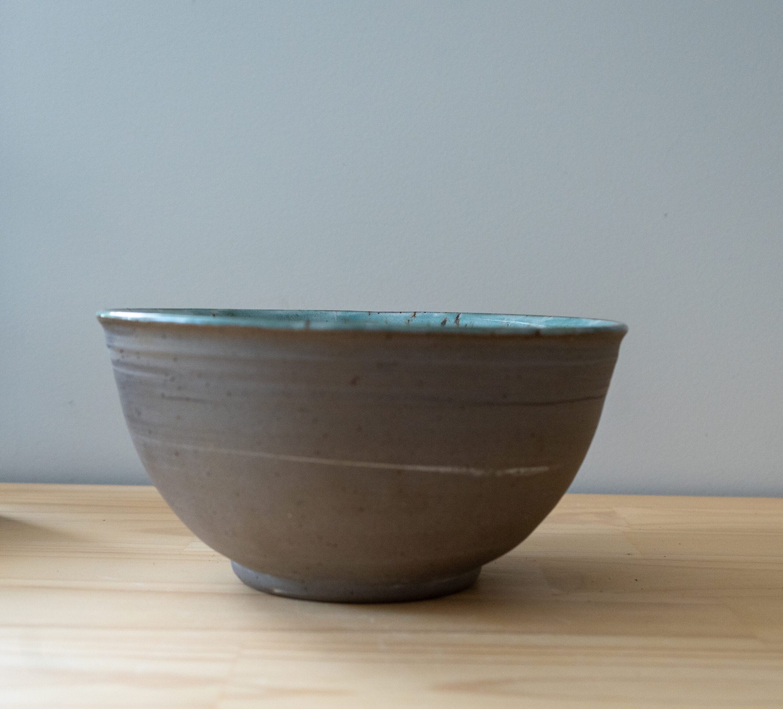 This bowl is handcrafted on a pottery wheel using a variety of different stonewares. The interior is finished with a teal splash glaze, creating a striking contrast against the raw, unglazed exterior. The exterior is left as raw clay, displaying natural patterns where the stoneware clays have mixed, . Suitable for everyday use or display.