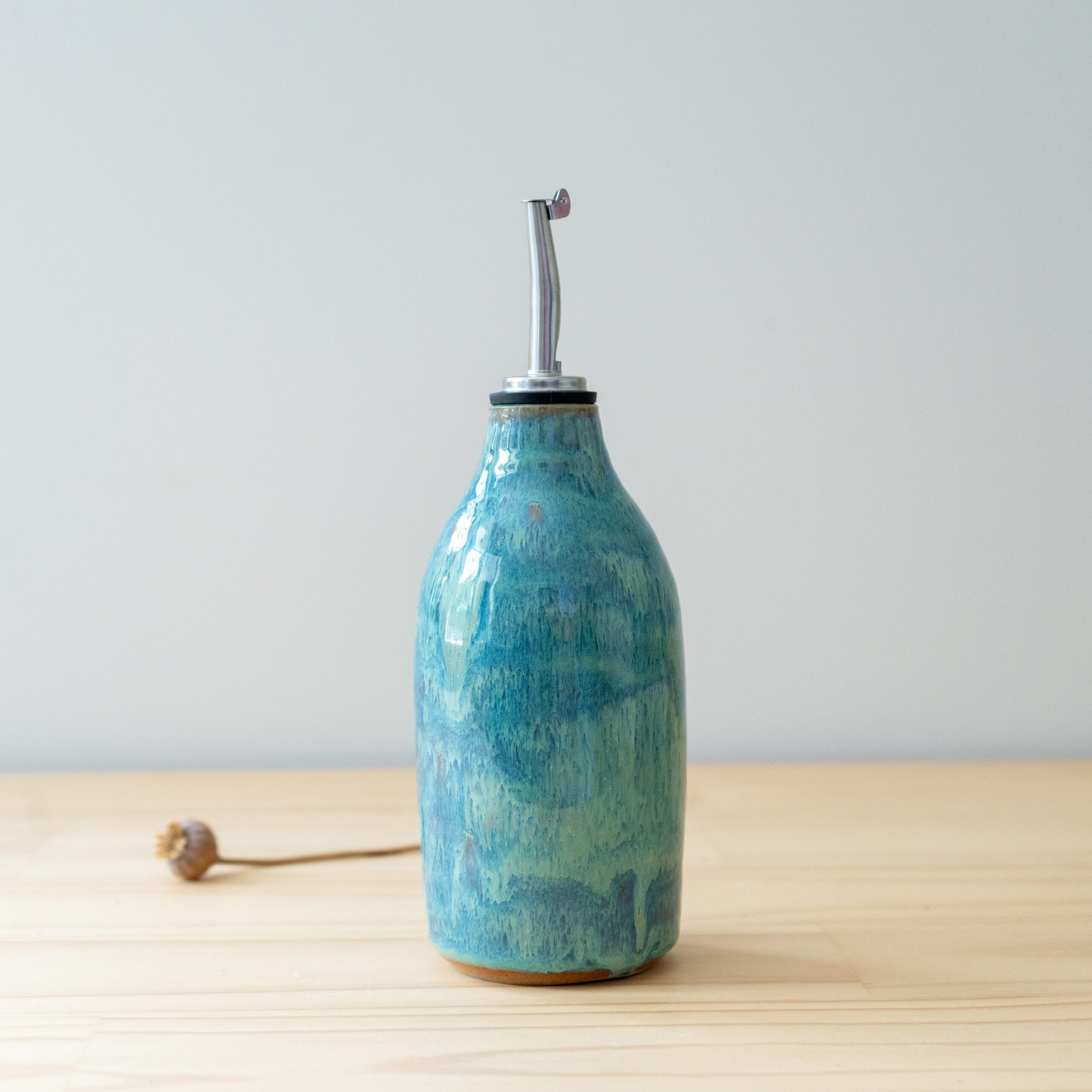 This oil pourer has been handcrafted on a pottery wheel. It is made with New Zealand buff clay and finished with a green blue wash glaze.