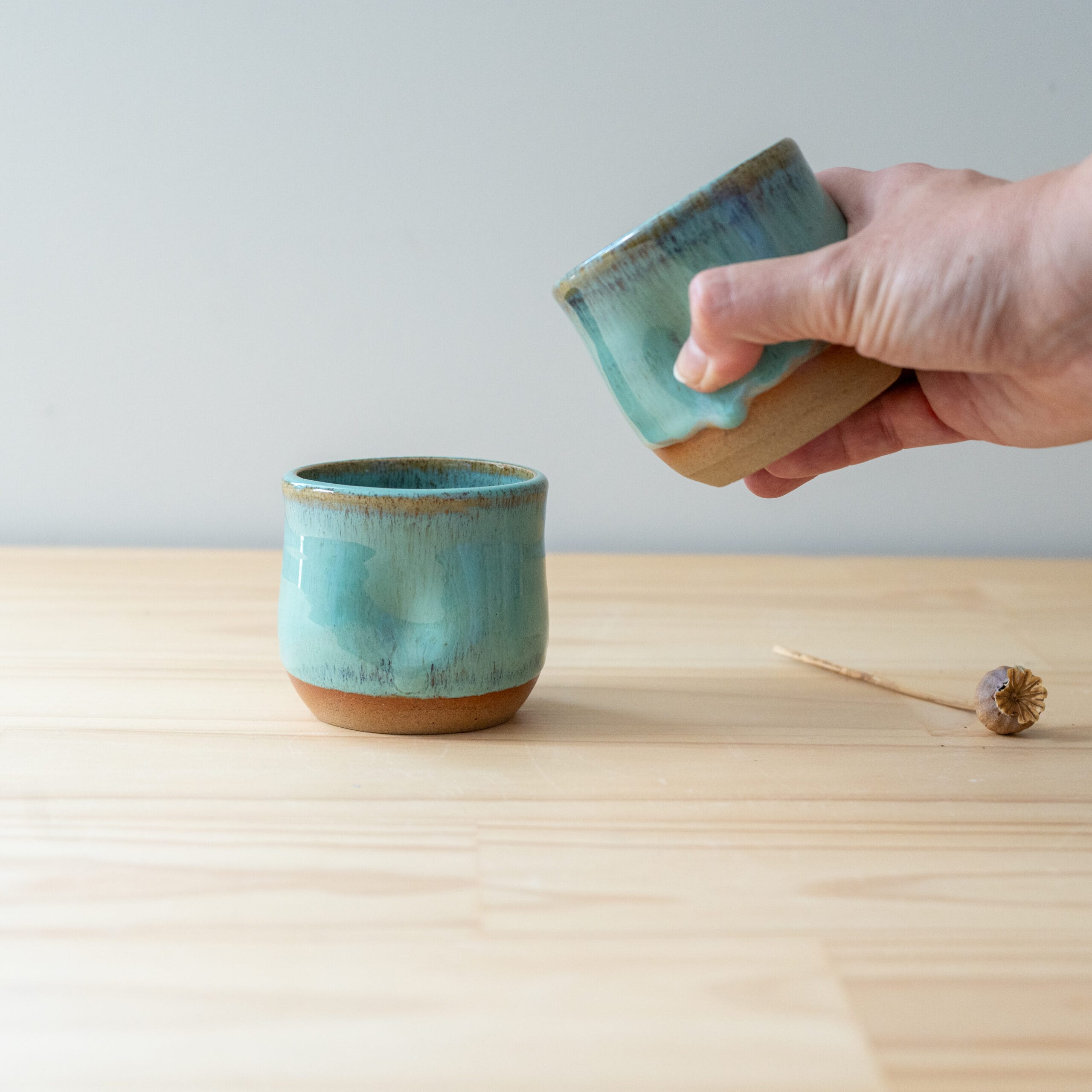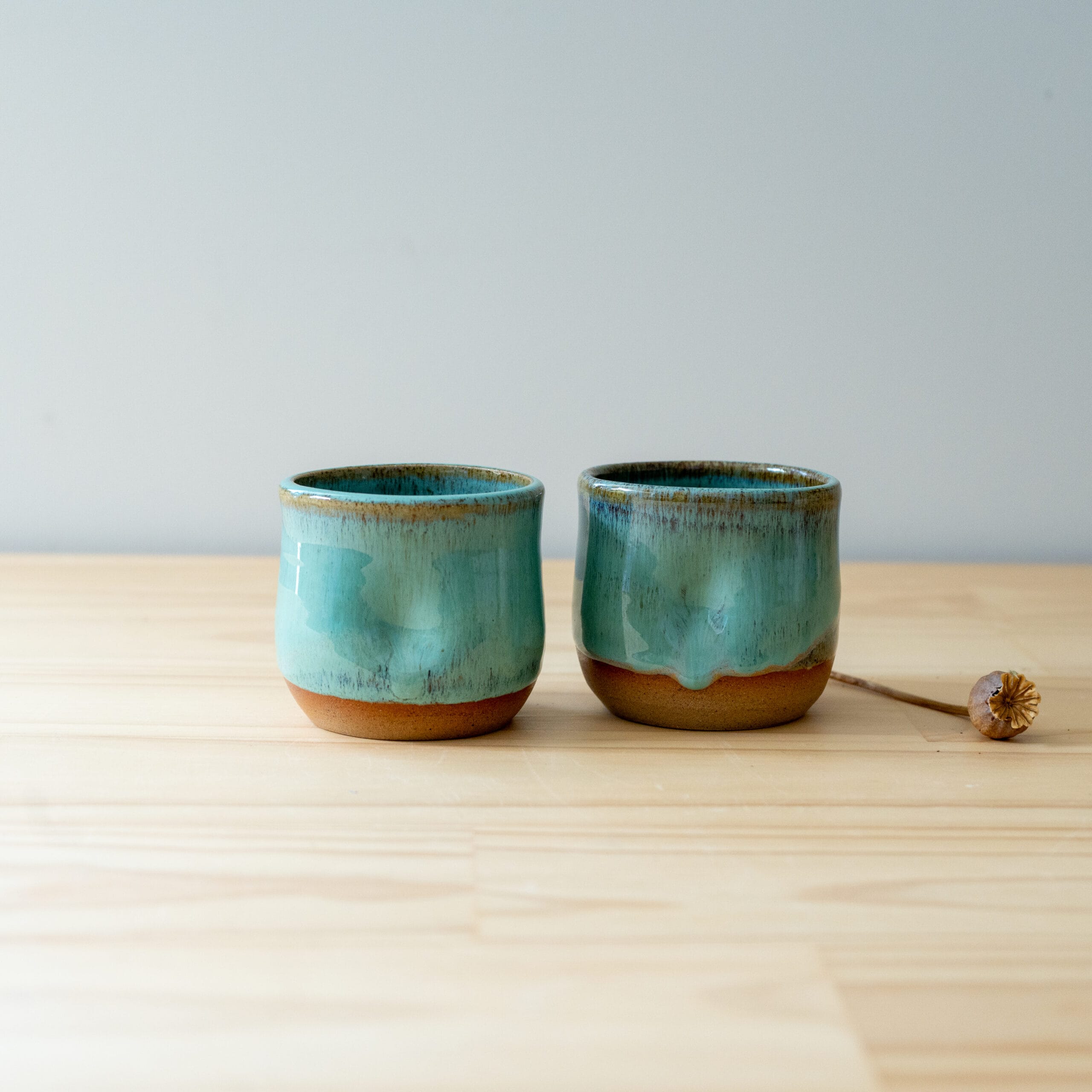 These tumblers has been handcrafted on a pottery wheel. It is made with mixed buff stoneware and finished with a floating green glaze.