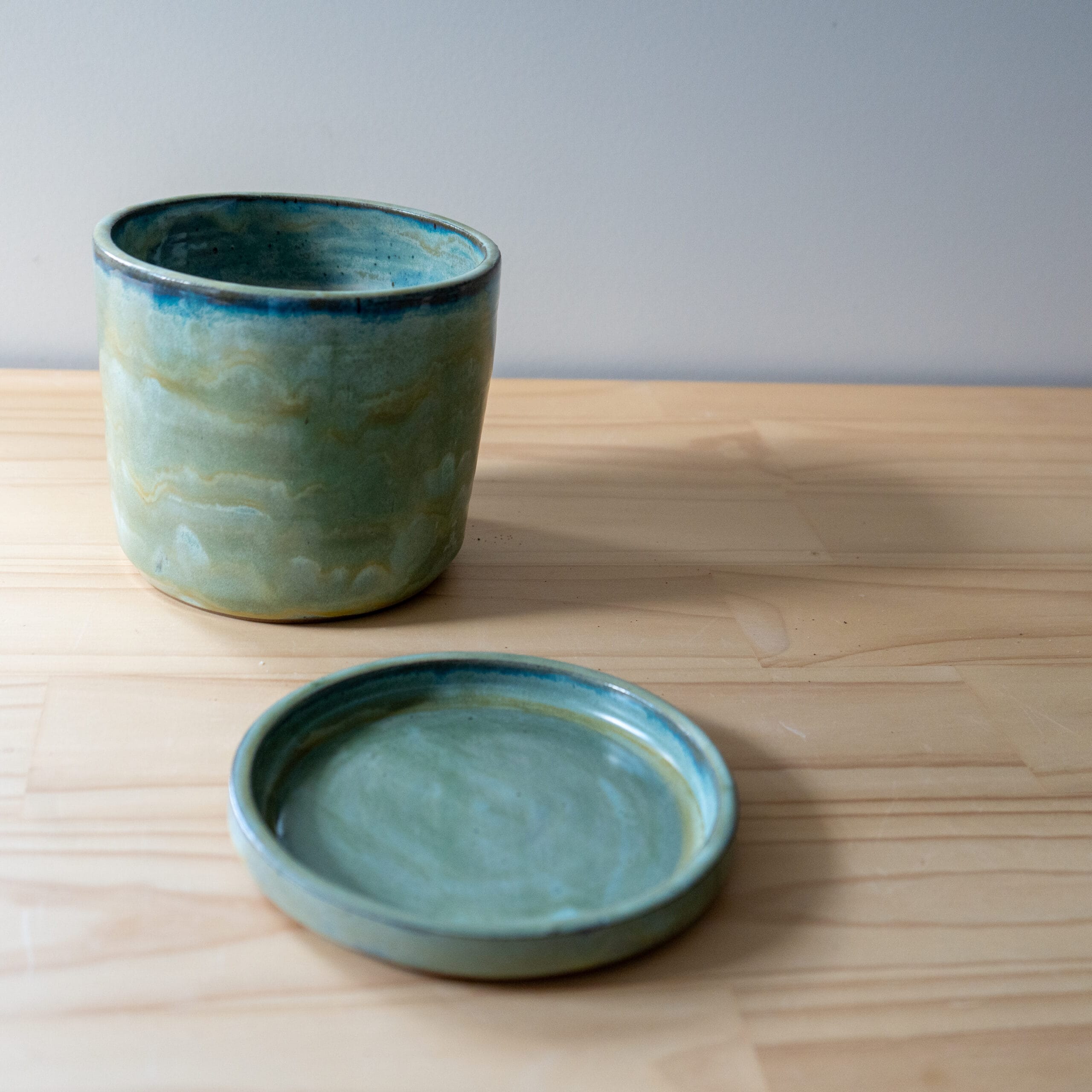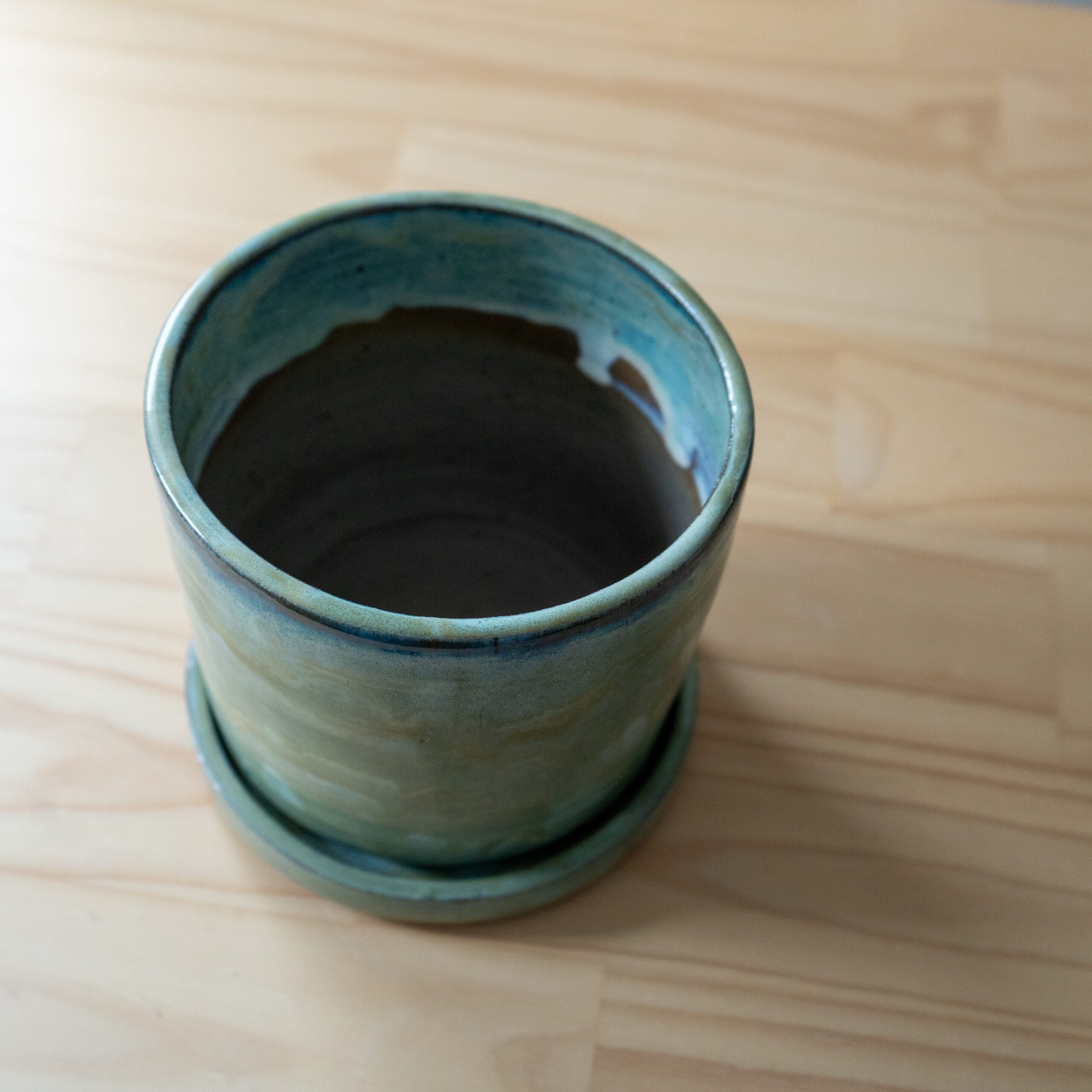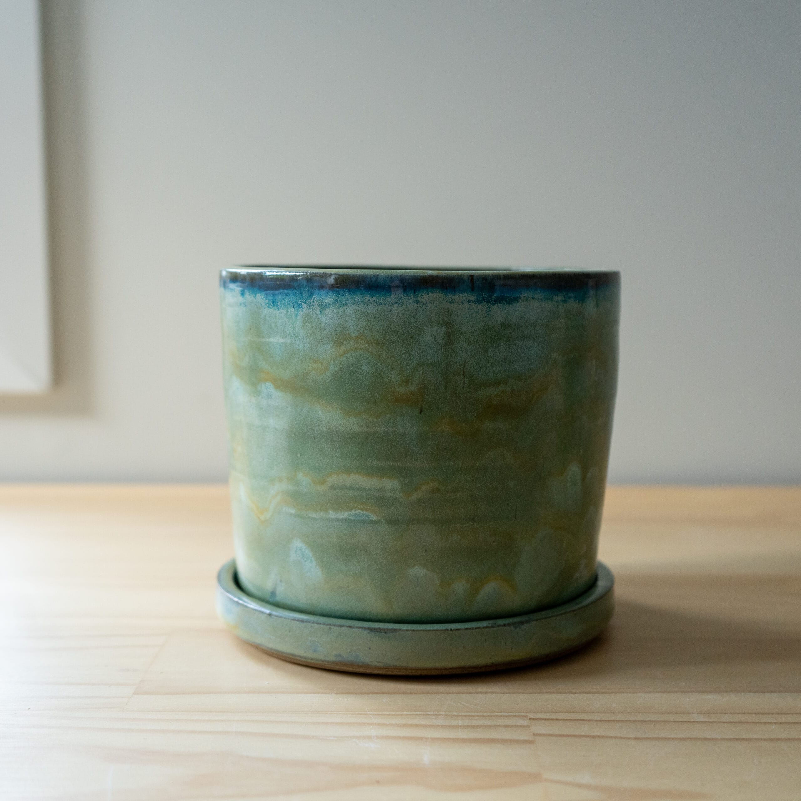 This planter has been handcrafted on a pottery wheel. It is made with mixed stonewares and finished with a green mix glaze. The planter has a drain hole and comes with a saucer.