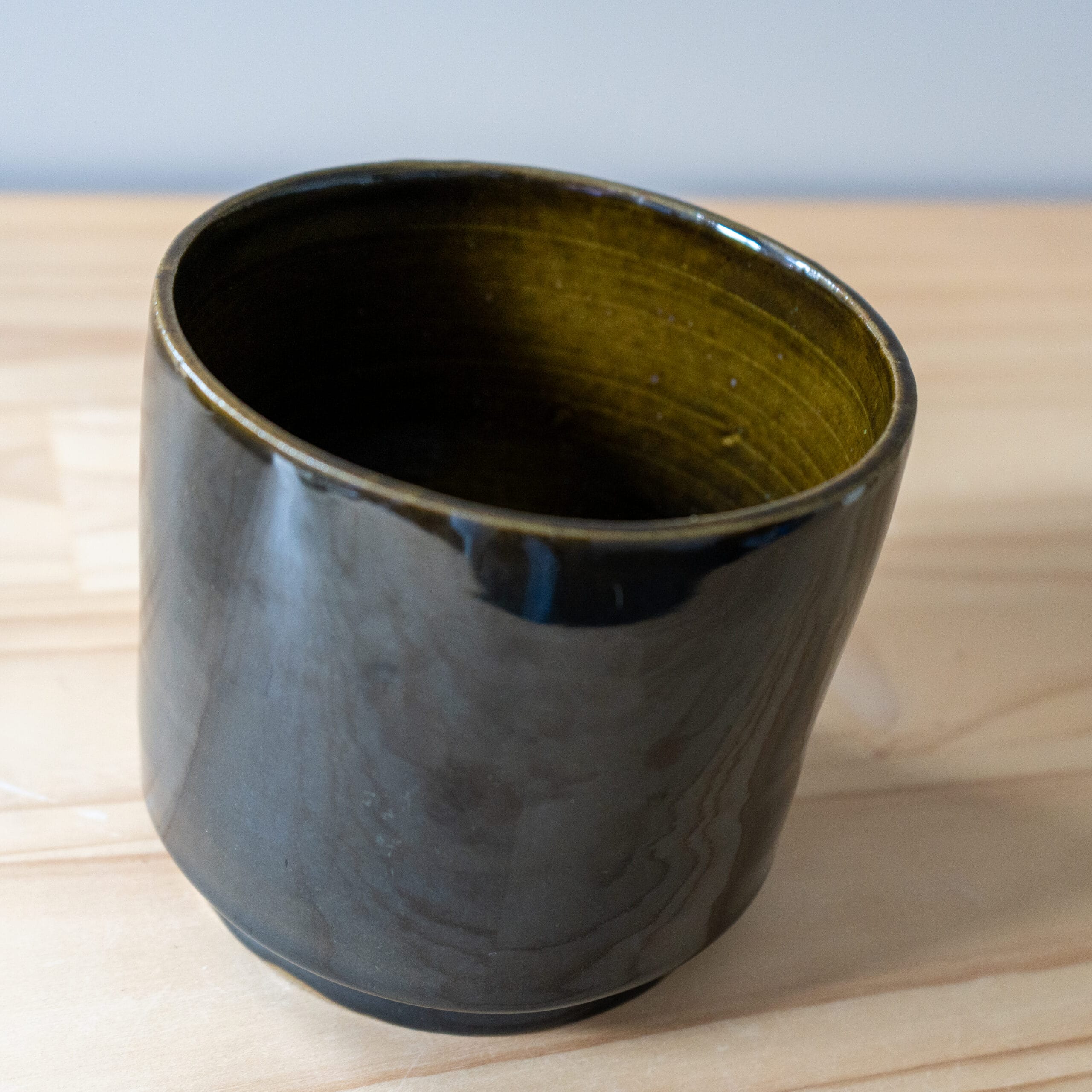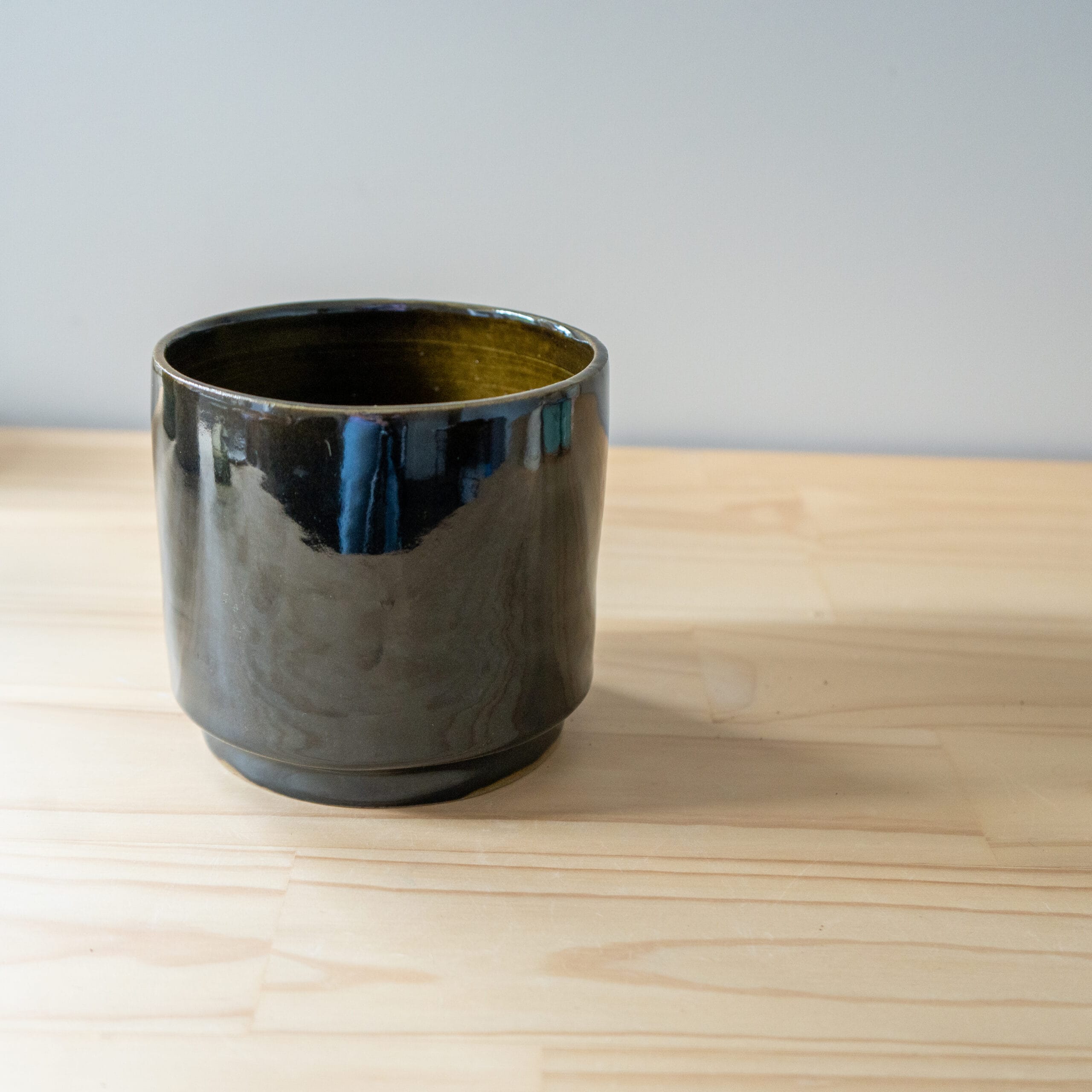 This planter has been handcrafted on a pottery wheel. It is made with mixed stonewares and finished with a moss glaze. The planter does not have a drain hole.