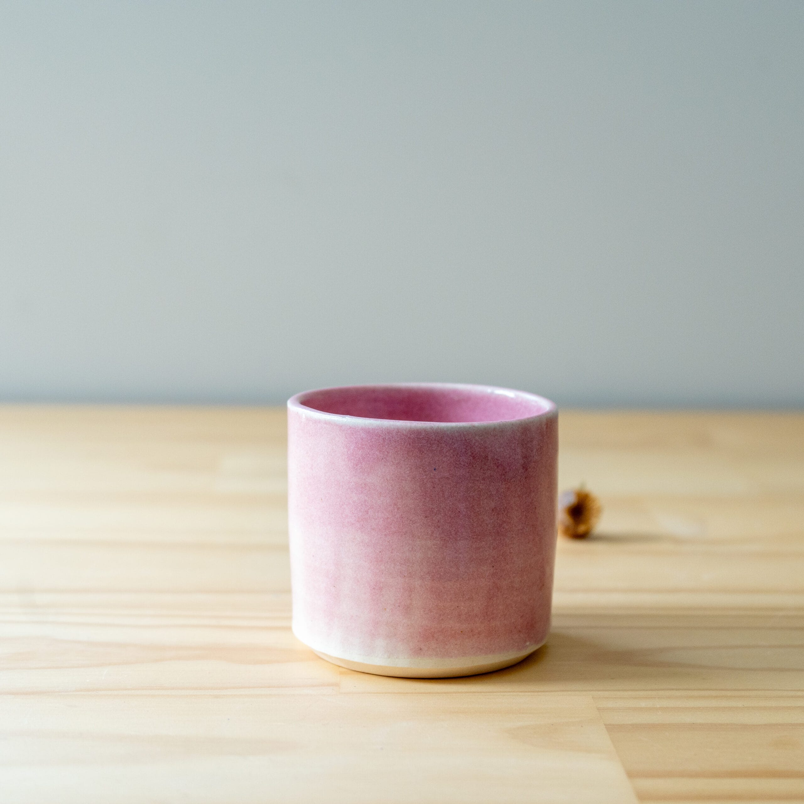 This tumbler has been handcrafted on a pottery wheel. It is made with mixed buff stoneware and finished with a pink glaze.