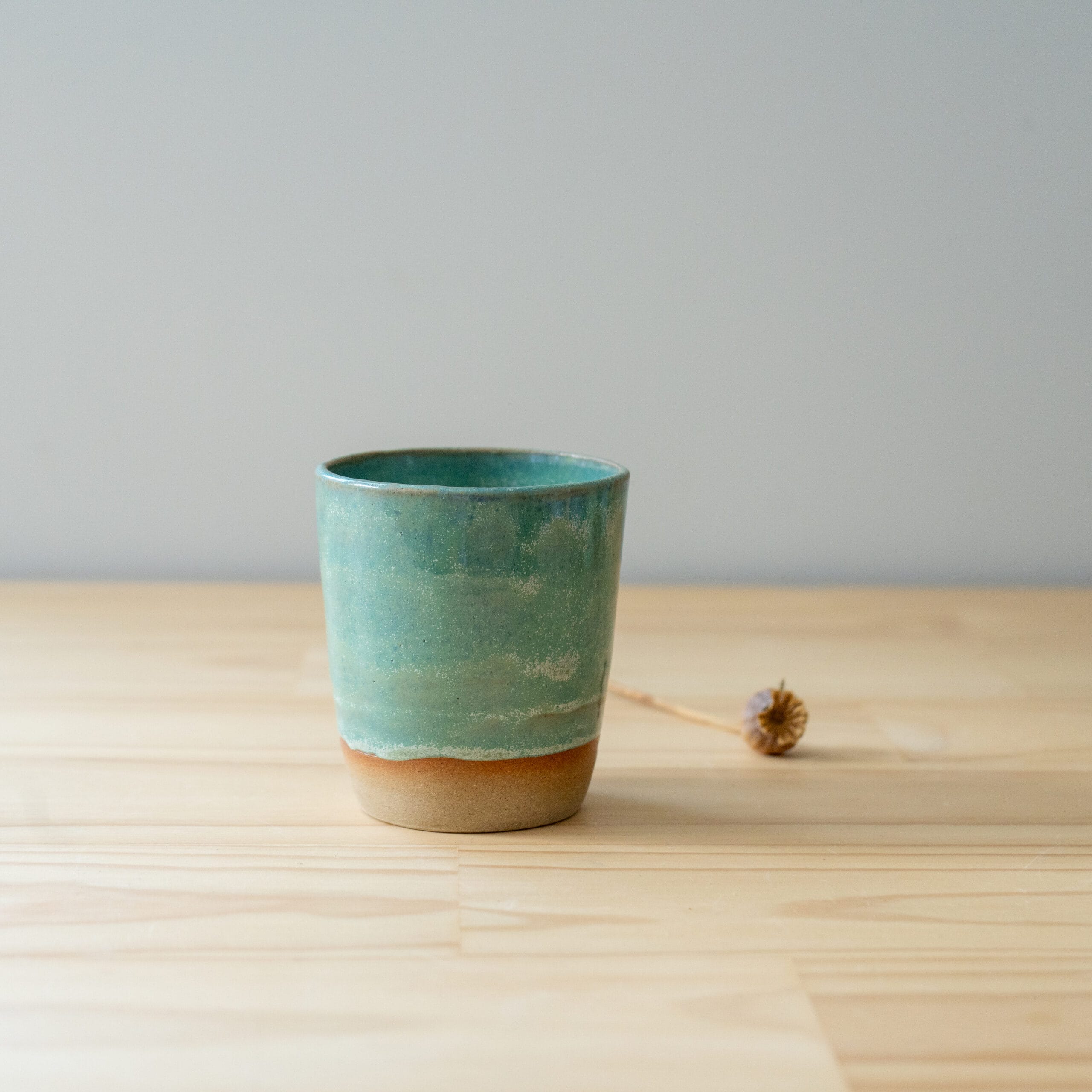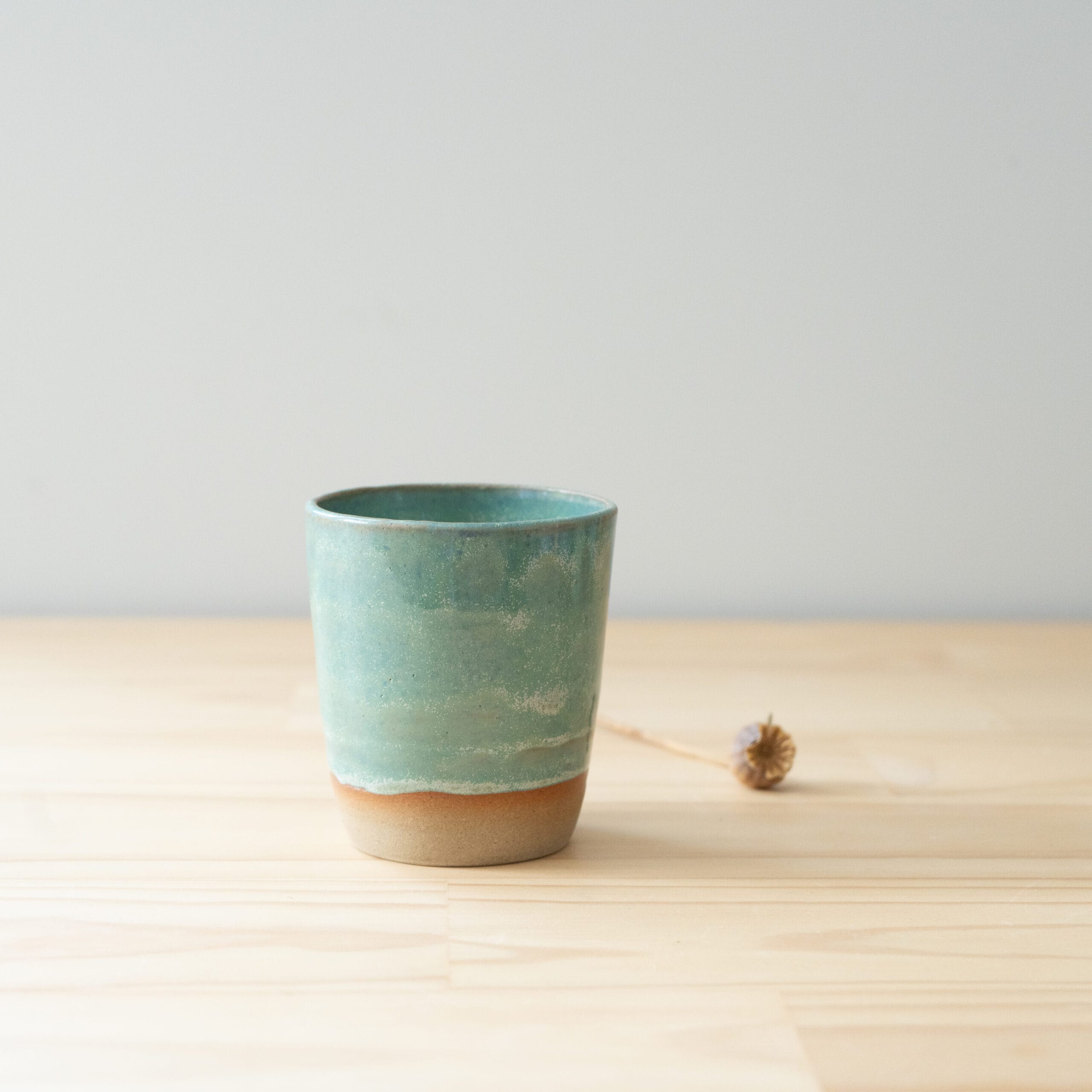 This tumbler has been handcrafted on a pottery wheel. It is made with New Zealand buff stoneware and finished with a green tea glaze.